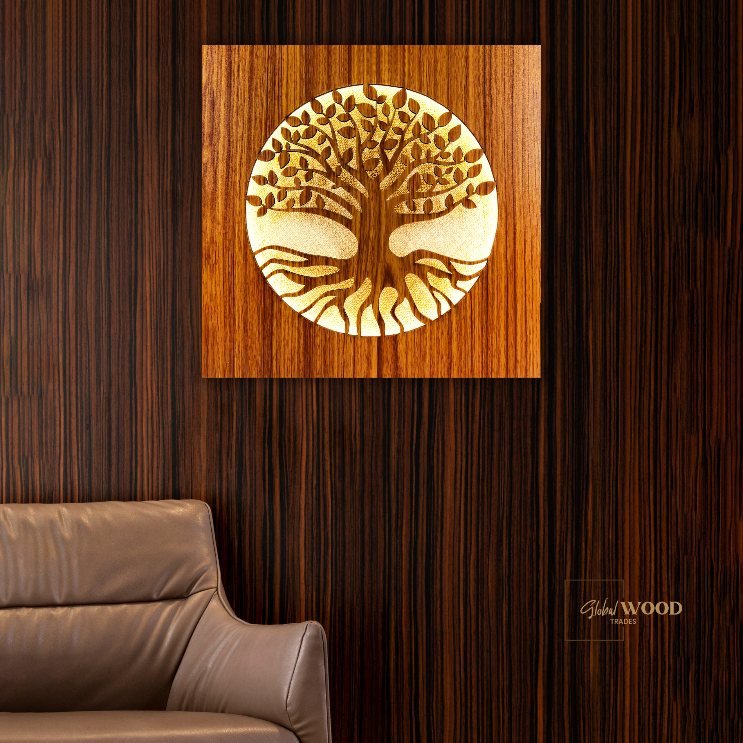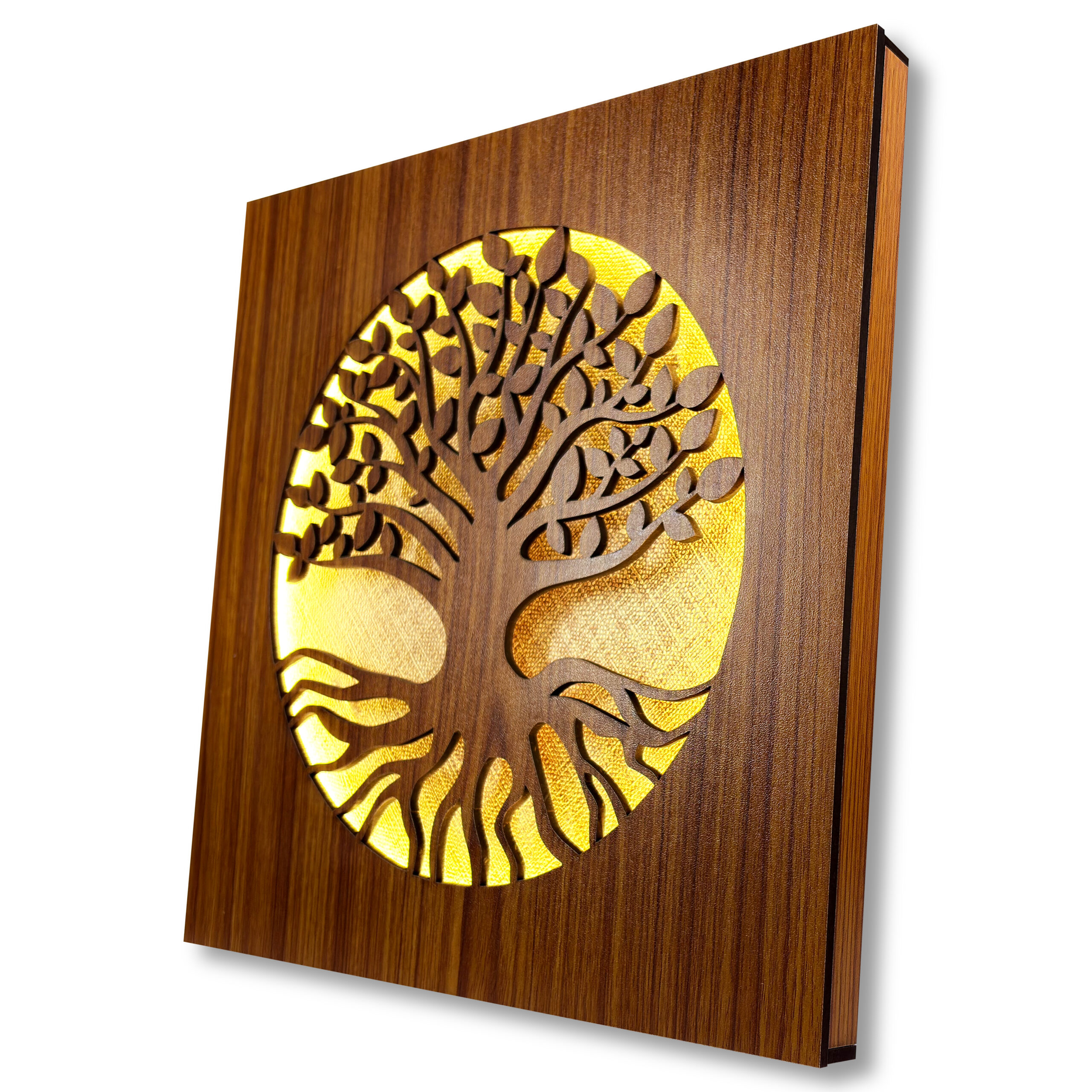 Premium Tree of Life LED wooden wall décor made from high-quality wood with a rich finish and warm backlighting. Perfect for living rooms, bedrooms, offices, and spiritual spaces. Size: 300×300 mm, Thickness: 22 mm.